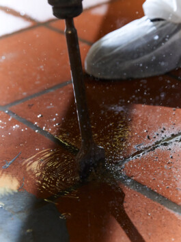 So stellt uns aktuell das gleichmäßige Zermahlen der Fliesen im Erdgeschoss – für Terrazzoböden – vor Herausforderungen. Andere Materialien sind leichter zu bearbeiten, jedoch kompliziert verbaut. So ist beispielsweise der Dielenboden im 2.OG verklebt und muss vorsichtig abgeschabt werden.